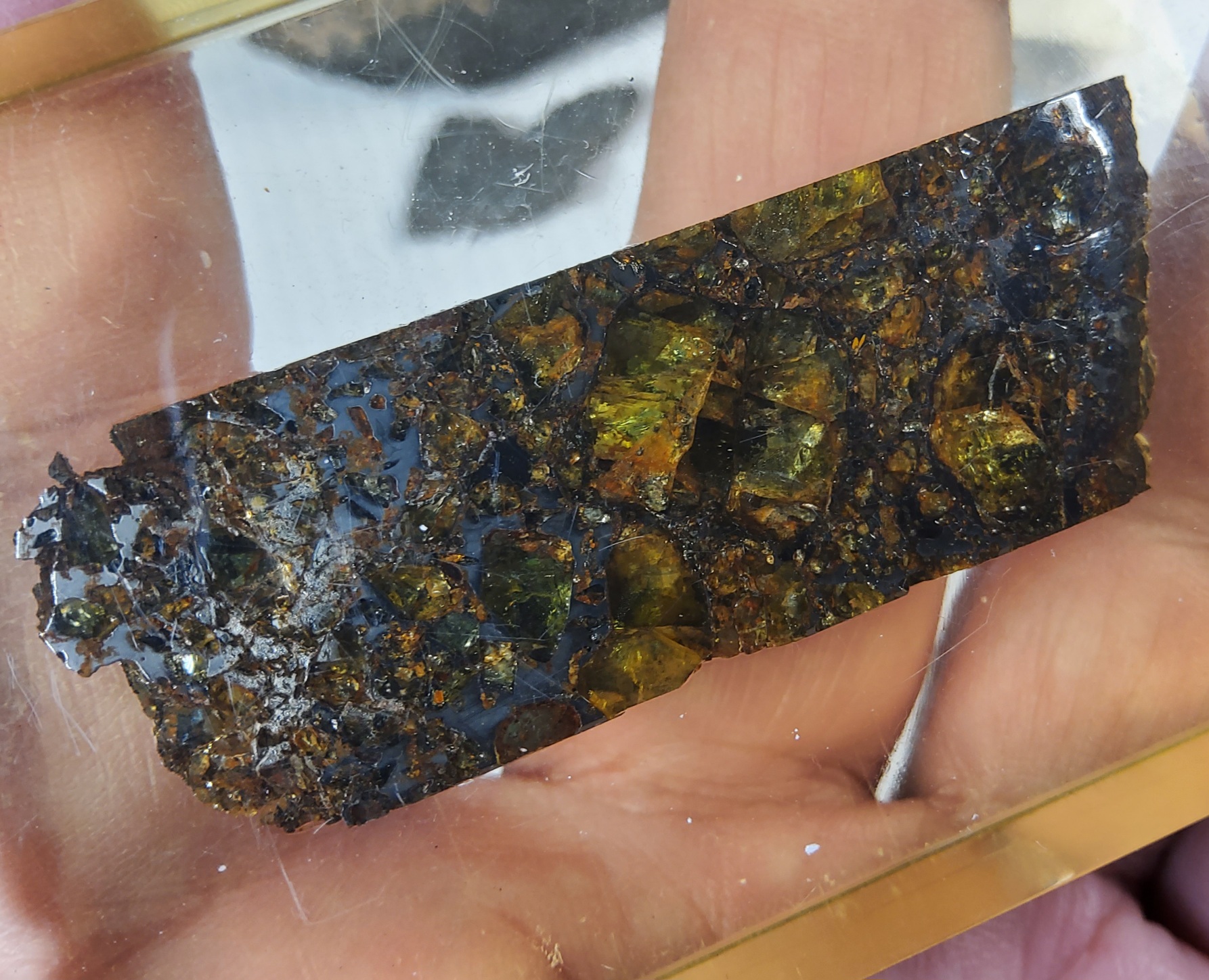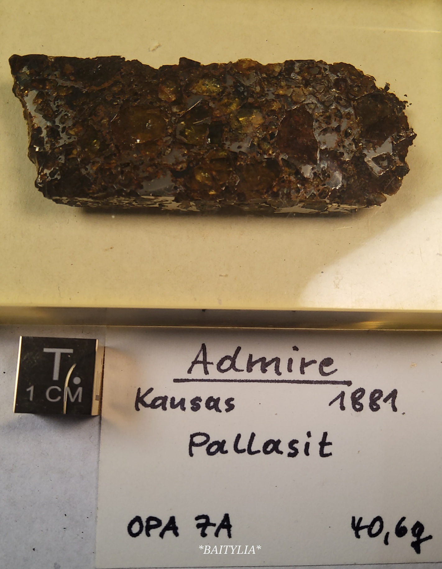 pallasite, find 1881, partslice, resin covered, stabil, prof.dr. J.Otto collection