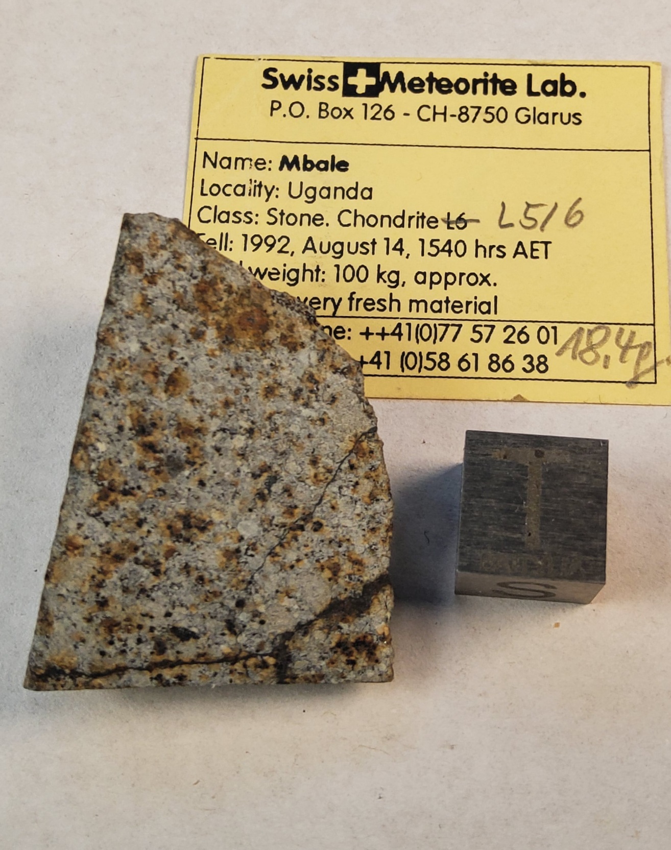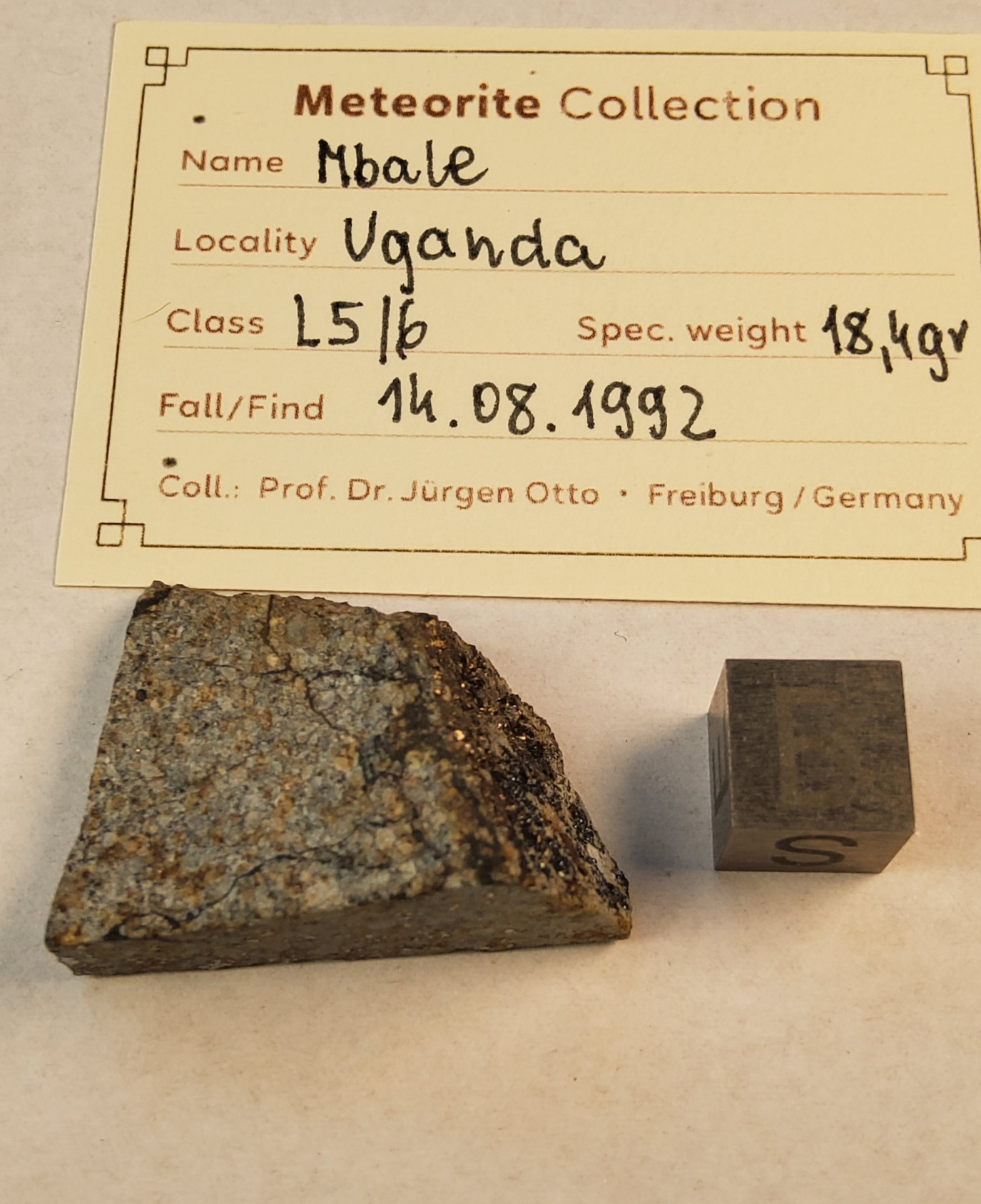 chondrite L5/6, witness fall 14 August 1992, Uganda, cut fragment , labels as pictured