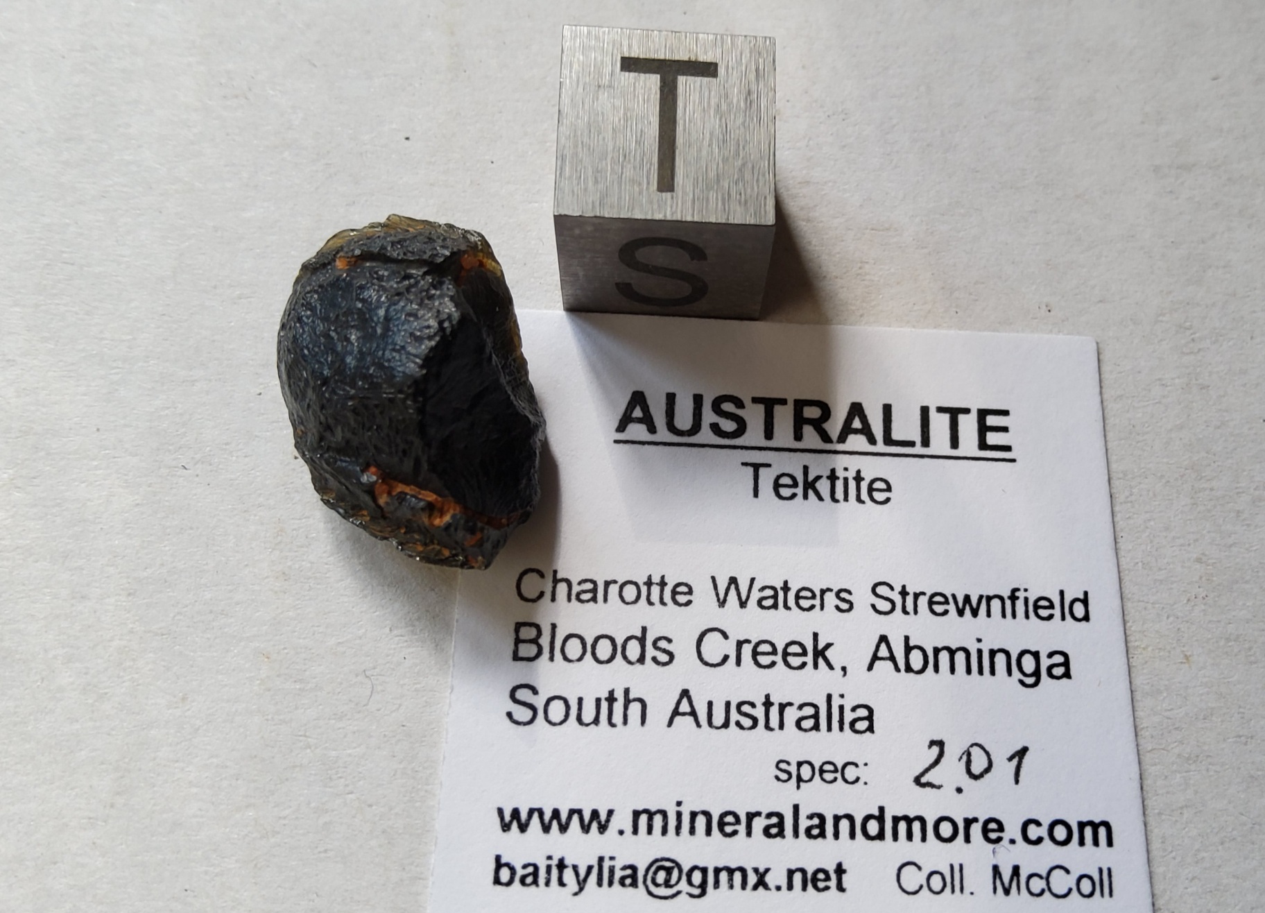 australite, 2.01gr, fragment with part of flange, nice shape, found in Charlotte Waters strewnfield, Blood Creek, Abminga , bought from finder, Don McColl collection